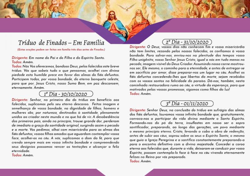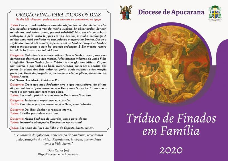 Dom Carlos José de Oliveira, nosso bispo diocesano ressalta que: “Lembrando dos falecidos, neste tempo de pandemia, recordamos quão passageira é a vida... Recordamos, também, que em Jesus temos a Vida Eterna”. Com este pensamento em mente e no coração Dom Carlos oferece a toda Diocese de Apucarana um Tríduo de Finados em Família a ser realizado nos dias 30/10 primeiro dia, 31/10 segundo dia e 01/11 terceiro dia, cada família se organize em algum momento oportuno para rezar as orações contidas no material que foi disponibilizado.