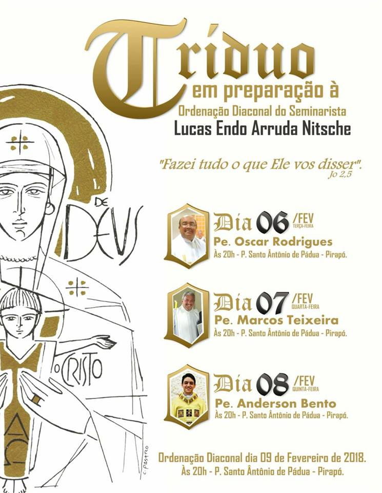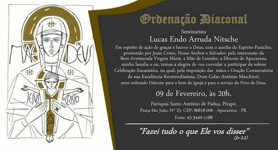 Seu Tríduo em preparação à Ordenação Diaconal será nos dias 06, 07 e 08 de Fevereiro na Paróquia Santo Antônio de Pádua de Pirapó, onde acontecerá a sua ordenação no dia 09 às 20:00h. Ainda nesse ano haverá a sua Ordenação Presbiteral, e Lucas será o único a ser ordenado na Diocese de Apucarana no ano de 2018.
