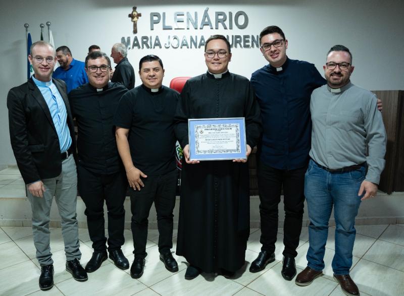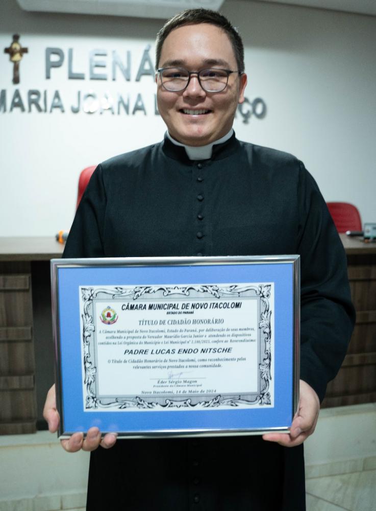 Aconteceu na terça-feira 14, na Câmara Municipal de Novo Itacolomi, a entrega de 5 Títulos de Cidadão Honorário, dentre eles, para o Pe. Lucas Endo, que foi pároco por 3 anos, 1 mês e 9 dias na paróquia N. Srª da Glória, homenagem proposta pelo vereador Maurídio, em reconhecimento pelos diversos trabalhos do padre Lucas, prestados à comunidade e paróquia, ainda no tempo da pandemia.