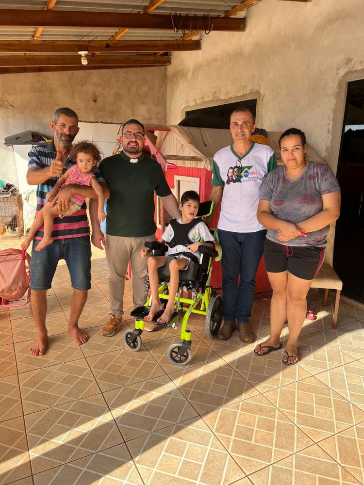 Uma família de Sabáudia, através dos meios de comunicação, estava pedindo ajuda para a compra de uma cadeira de rodas adaptada para o menino Luan. Estavam solicitando ajuda através de uma vaquinha virtual. Dom Carlos, viu o pedido de ajuda, entrou em contato com o Pe. Willian, pároco daquela cidade, pedindo que fizesse uma visita, conhecendo a realidade e a necessidade daquela família. No sábado, dia 14/01, Pe. Willian juntamente com Marcelo Franzin, presidente dos Vicentinos da Paróquia Santa Teresinha, visitaram a família, que inclusive já passou a ser assistida com uma cesta básica todos os meses. Comunicando a Dom Carlos a realidade, ele autorizou a compra da cadeira, que custou R$ 4.680,00. Foi feito o pedido, e num prazo de mais ou menos 40 a 50 dias estava pronta e adaptada as necessidades do menino Luan. Na sexta-feira, dia 24/03, foi feita a entrega, foi um momento de muita emoção e gratidão por parte da família do Luan, e também por parte da Paróquia Santa Teresinha e do Sedic (Serviço Diocesano de Caridade), que pôde ajudar esta família que estava precisando. Gratidão a todos de nossa diocese que colaboram, adquirindo os panetones (no período do Natal) e as Colombas (no período da Páscoa).